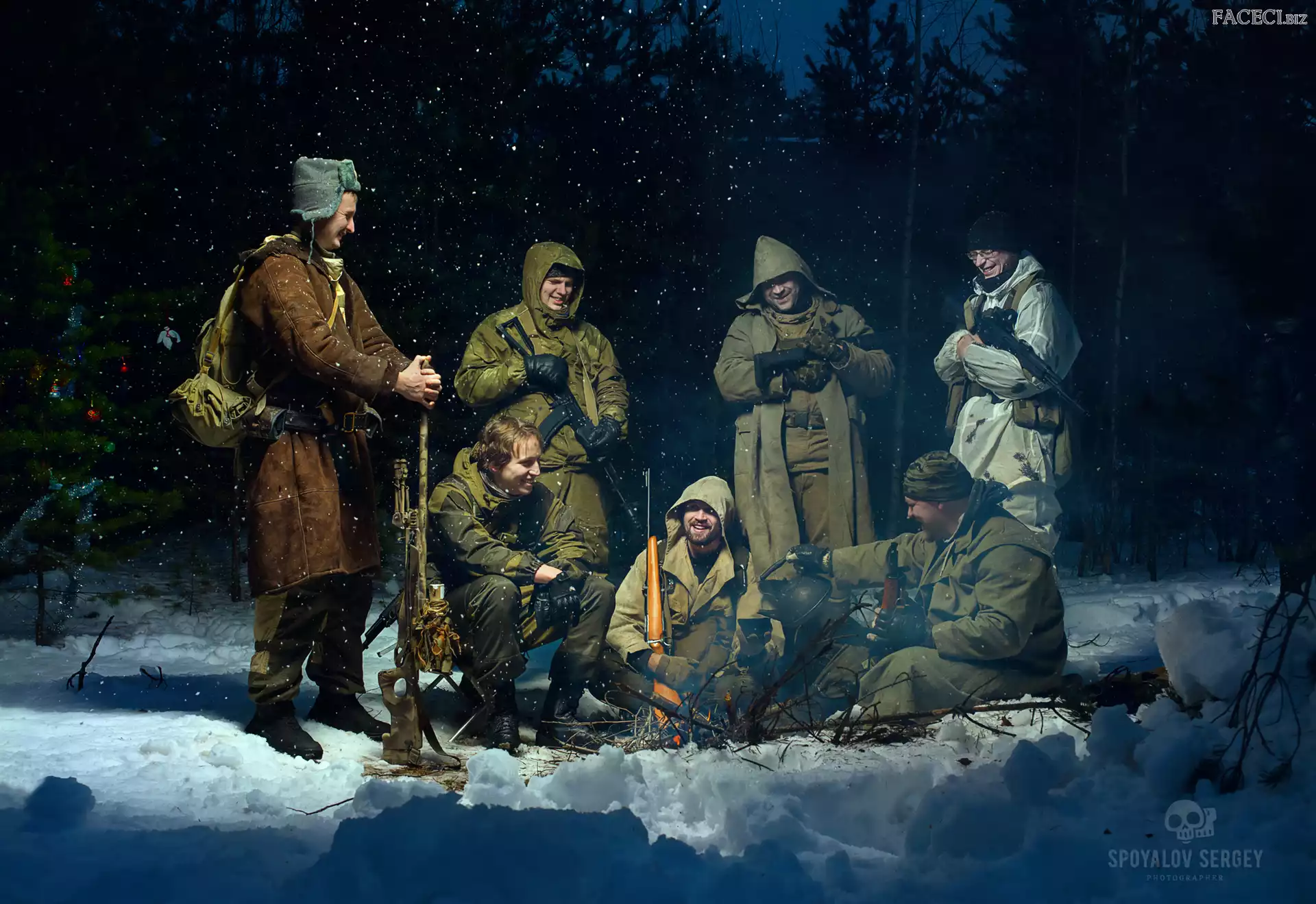 Ognisko, Żołnierze, Śnieg, Zima, Las - faceci.biz